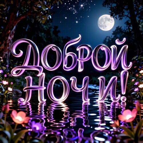 Красивая и атмосферная открытка с надписью «Доброй ночи!» на фоне ночного пейзажа. Изображение выполнено в магическом стиле с использованием фиолетовых и синих тонов. На картинке видна полная луна, светящиеся звезды, темный лес и спокойная гладь воды, в которой отражаются светящиеся объемные буквы. На переднем плане нежно цветут цветы. Идеально подходит для отправки в мессенджерах (WhatsApp, Viber, Telegram) или социальных сетях, чтобы пожелать приятных снов близким, друзьям или любимым.