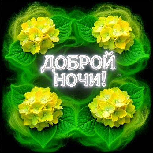 Красивая и яркая открытка с пожеланием доброй ночи. На изображении представлены четыре пышных соцветия желтых гортензий на фоне сочных зеленых листьев. Композиция симметрична и имеет мягкое свечение, создающее уютную и спокойную атмосферу. В центре расположена стильная белая надпись на русском языке «ДОБРОЙ НОЧИ!». Идеально подходит для отправки в мессенджерах (WhatsApp, Viber) и социальных сетях в качестве приятного ночного приветствия для друзей и близких.