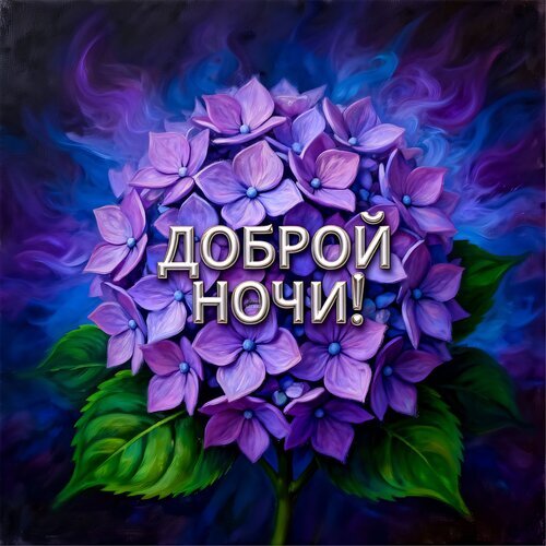 Красивая поздравительная открытка с изображением пышного букета фиолетовых гортензий на темном мистическом фоне с оттенками синего и пурпурного. На переднем плане расположена эффектная надпись серебристым шрифтом «ДОБРОЙ НОЧИ!». Изображение выполнено в художественном стиле, напоминающем масляную живопись, с мягкими световыми акцентами и глубокими цветами, что создает атмосферу спокойствия, уюта и волшебства. Идеально подходит для отправки в мессенджерах и социальных сетях в качестве пожелания приятных снов.