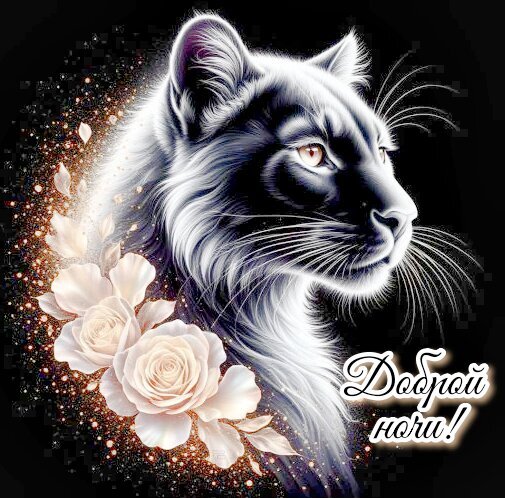 Красивая и эстетичная открытка с изображением величественного белого леопарда или пантеры. Изображение выполнено в контрастном стиле на черном фоне, где детализированная белоснежная шерсть животного переплетается с нежными светлыми розами. Вокруг леопарда создано волшебное сияние и золотистые искры, создающие атмосферу волшебства и уюта. В нижнем правом углу расположена надпись на русском языке «Доброй ночи!», что делает это изображение идеальным для отправки в мессенджерах и социальных сетях в качестве пожелания спокойной ночи близким и друзьям.