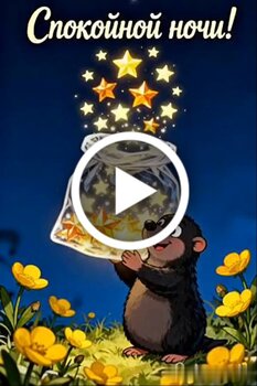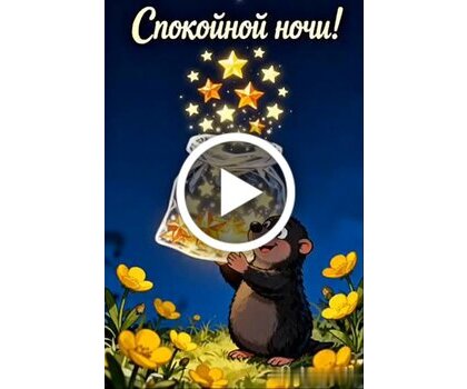 Это милое и успокаивающее анимационное видео создано для пожелания спокойной ночи. В центре сюжета находится очаровательный маленький зверек, который стоит среди полевых желтых цветов под ночным небом. Герой держит стеклянную банку, из которой вверх взлетают яркие светящиеся золотые звезды. Магическое сияние звезд и мягкая анимация создают атмосферу уюта, сказки и спокойствия. Видео идеально подходит для того, чтобы отправить близким или детям перед сном, подарив им ощущение волшебства и добрых снов.