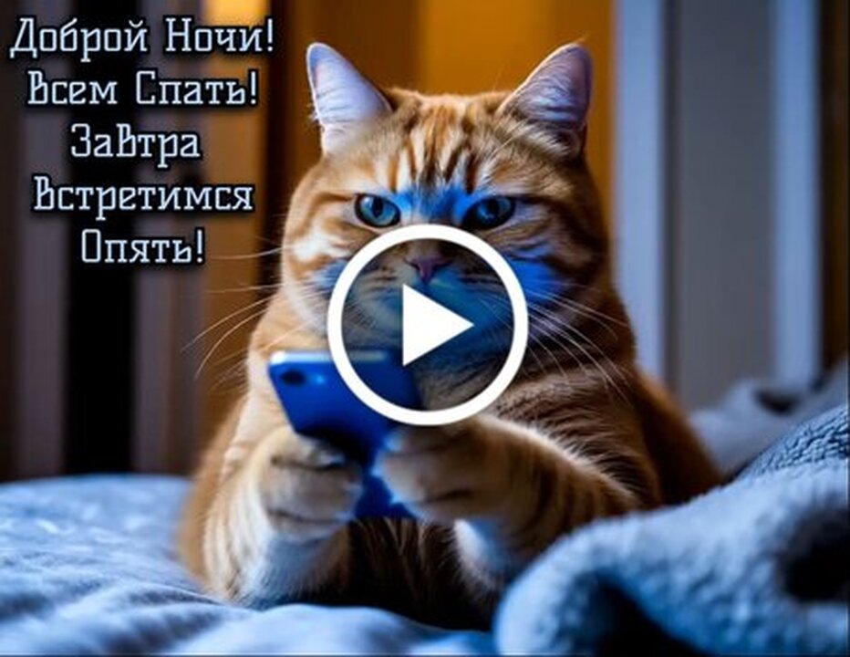Милое и забавное видео с рыжим котом который перед сном увлеченно сидит в смартфоне. Сначала котик сосредоточенно смотрит в экран телефона подсвеченный синим светом, затем он решает отложить гаджет укрывается мягким одеялом и засыпает. Видео наполнено уютом и спокойствием и сопровождается добрыми пожеланиями спокойной ночи и встречи на следующий день. Идеально подходит для того чтобы пожелать доброй ночи вашим друзьям и близким.