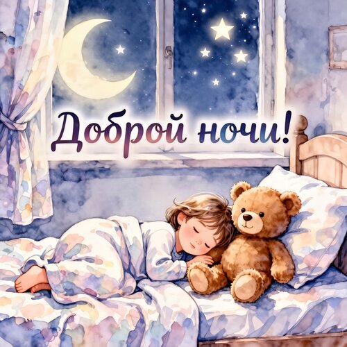 Милая и уютная иллюстрация на тему «Доброй ночи». На картинке изображена маленькая девочка, сладко спящая в кровати и обнимающая плюшевого мишку. За окном сияет полная луна и яркие звезды на ночном небе, создавая атмосферу спокойствия, волшебства и умиротворения. Идеально подходит для поздравительных открыток, пожеланий спокойной ночи детям и создания уютного настроения в социальных сетях. Иллюстрация выполнена в мягких акварельных тонах.