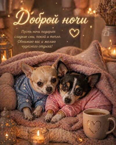 Милая открытка с изображением двух маленьких чихуахуа, уютно устроившихся под теплым розовым пледом. На картинке присутствует красивая надпись на русском языке: «Доброй ночи! Пусть ночь подарит сладкие сны, покой и тепло. Обнимаю вас и желаю чудесного отдыха!» Атмосфера изображения наполнена уютом, теплом и нежностью благодаря мягкому освещению и мерцающим огням гирлянд на заднем плане. Идеально подходит для отправки близким, друзьям или любимым в качестве пожелания спокойной ночи.