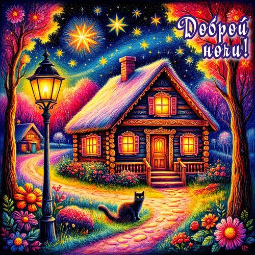 Сказочная и уютная цифровая иллюстрация ночного пейзажа. В центре композиции — очаровательный деревянный домик с зажженным светом в окнах, стоящий под звездным небом. На переднем плане виден старинный уличный фонарь, излучающий теплый свет, и милый черный кот, сидящий на тропинке. Вокруг дома цветут яркие цветы, а деревья окутаны волшебным ночным сиянием. Атмосфера картины наполнена спокойствием, магией и уютом. Идеально подходит для создания настроения «доброй ночи» и сказочного волшебства.