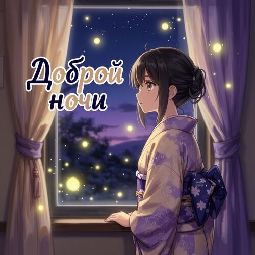 Аниме-арт в вечерних тонах: молодая девушка в традиционном японском кимоно стоит у окна и смотрит на ночное небо. За окном видны звезды и мерцающие светлячки, создающие волшебную и уютную атмосферу. На изображении крупная надпись на русском языке «Доброй ночи». Идеально подходит для пожеланий спокойной ночи, статусов в соцсетях и создания расслабляющего настроения. Стиль цифровой живописи с мягким освещением.