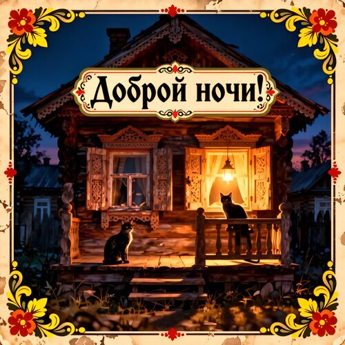 Уютная и атмосферная открытка с пожеланием «Доброй ночи!». На изображении запечатлен старинный деревянный деревенский дом в сумерках. Из окна льется теплый свет лампы, освещающий крыльцо, на котором сидят два черных кота. Картина обрамлена красивым декоративным узором в стиле хохломы с красными цветами и желтыми лепестками. Идеально подходит для отправки друзьям и близким в мессенджерах для создания теплого вечернего настроения.