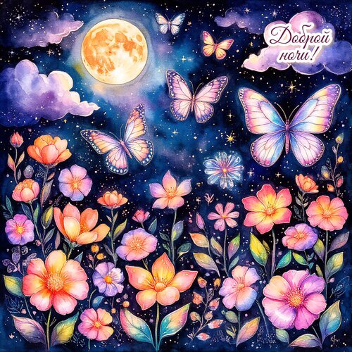 Волшебная акварельная иллюстрация ночного пейзажа, наполненная магией и уютом. На фоне глубокого синего звездного неба с полной луной и мягкими облаками парят яркие разноцветные бабочки. Нижнюю часть композиции украшает пышный цветущий сад с нежными розовыми, оранжевыми и фиолетовыми цветами. В верхнем правом углу каллиграфическая надпись на русском языке «Доброй ночи!». Изображение выполнено в сказочном стиле, идеально подходит для использования в качестве открытки, обоев для рабочего стола или декоративных элементов для пожелания спокойной ночи.