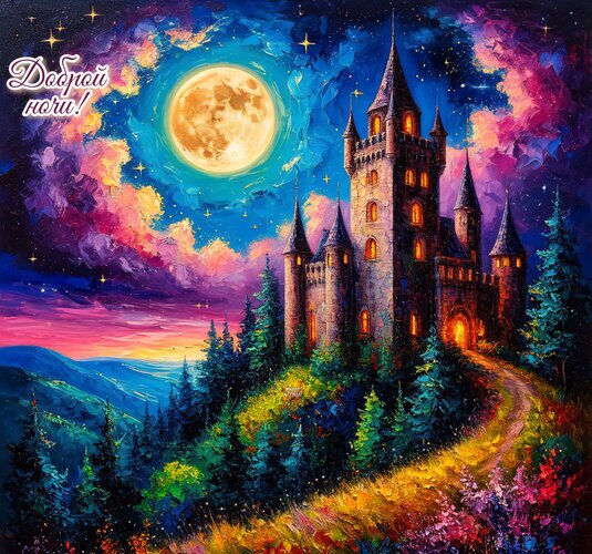 Сказочный ночной пейзаж с величественным старинным замком под огромной полной луной. Картина выполнена в стиле импрессионизма с яркими, насыщенными мазками. На изображении запечатлен магический замок на холме, окруженный густым хвойным лесом и цветущими растениями. Небо окрашено в фантастические оттенки фиолетового, розового и синего, а сияющая луна освещает сказочный ландшафт. Атмосфера наполнена волшебством, уютом и спокойствием идеальной ночи. Идеально подходит для использования в качестве открытки «Доброй ночи» или декоративного цифрового искусства.