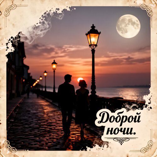 Романтичная и атмосферная картинка в стиле ретро, изображающая силуэты влюбленной пары, гуляющей по мощеной набережной во время заката или сумерек. На фоне видны старинные уличные фонари, излучающие теплый свет, спокойная гладь воды и полная луна в небе. Изображение оформлено в винтажном стиле с эффектом состаренной бумаги и декоративными уголками. В правом нижнем углу расположена красивая надпись на русском языке «Доброй ночи.», что делает это изображение идеальным для пожелания спокойной ночи близким, друзьям или любимым. Идеально подходит для соцсетей, мессенджеров и создания уютного вечернего настроения.