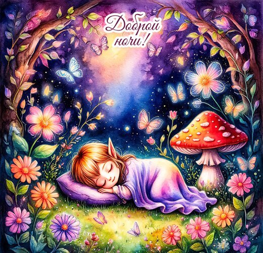 Сказочная и уютная цифровая иллюстрация, изображающая маленькую спящую лесную фею под одеялом на мягкой траве. Композиция обрамлена волшебным лесом с пышными цветами, яркими грибами-мухоморами и мерцающими бабочками. Атмосфера наполнена магическим ночным светом, фиолетовыми и синими оттенками звездного неба. В верхней части картинки каллиграфическая надпись на русском языке «Доброй ночи!». Идеально подходит для использования в качестве поздравительной открытки, обоев на телефон или тематического контента для соцсетей в стиле фэнтези и сказки.