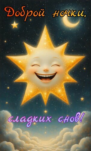 Красочная поздравительная открытка на тему «Доброй ночи». На изображении представлено улыбающееся антропоморфное солнце с закрытыми глазами на фоне ночного звездного неба с луной и мягкими облаками. Внизу расположена надпись «сладких снов!». Иллюстрация выполнена в теплых золотистых и глубоких синих тонах, создавая уютную, сказочную и позитивную атмосферу. Идеально подходит для отправки в мессенджерах и социальных сетях в качестве милого пожелания спокойной ночи.