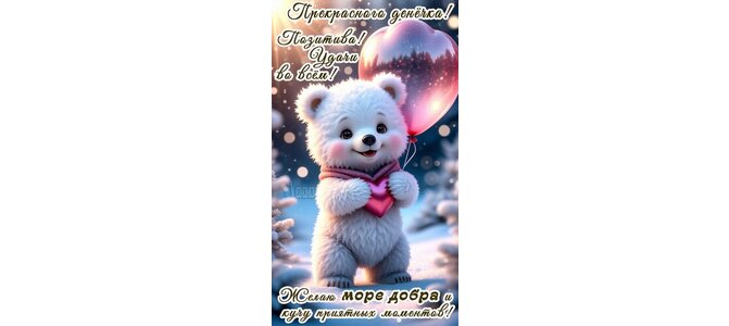 Теги:добрый день, день, мишка снег, зима, позитива, добра, лес, шарик, сердечко, позитив, приятных моментов, красивая картинка, пожелания на каждый день