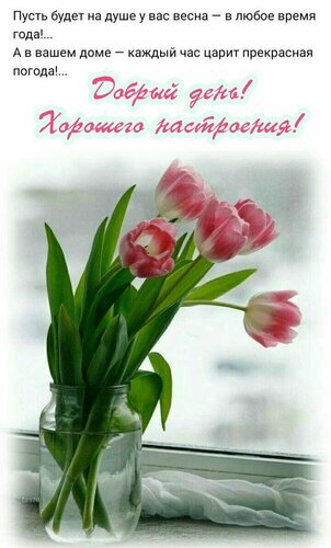 Пусть будет на душе у вас весна — в любое время года! А в вашем доме — каждый час царит прекрасная погoда! Добрый день. Хорошего настроения.