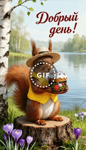 Милая открытка с изображением рыжей белки в соломенной шляпе и желтом жилете, которая держит пасхальный кулич. Белка сидит на пеньке на фоне живописного летнего пейзажа с озером, лесом и фиолетовыми крокусами. На картинке каллиграфическая надпись на русском языке «Добрый день!». Идеально подходит для поздравлений, пожеланий доброго дня и создания весеннего настроения в социальных сетях и мессенджерах.