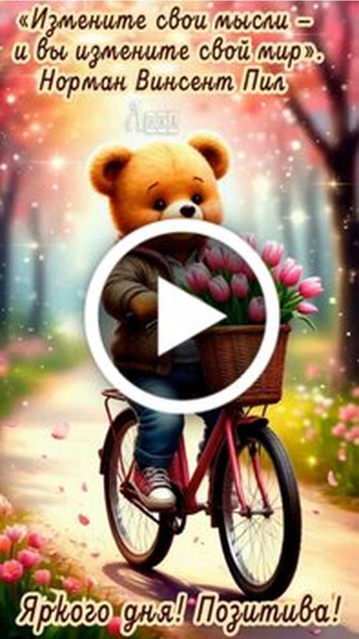 Это вдохновляющее видео наполнено позитивными эмоциями и мудростью. На экране предстает очаровательный мишка, который едет на велосипеде по живописной солнечной аллее. В корзине его велосипеда красуется пышный букет розовых тюльпанов, а вокруг порхают яркие бабочки. Видео сопровождает глубокая цитата Нормана Винсента Пила о том, что изменение мыслей ведет к изменению окружающего мира. Это идеальный ролик для того, чтобы поднять настроение, зарядиться оптимизмом и начать свой день с прекрасных мыслей. Посмотрите это видео, чтобы почувствовать тепло и радость природы.