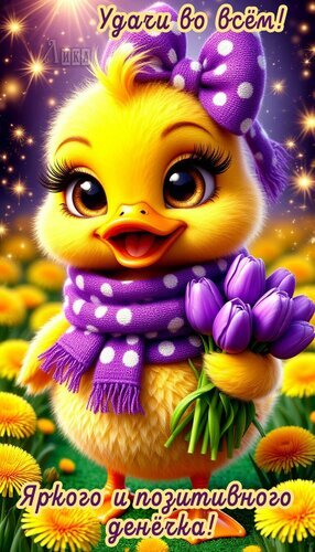 Милая и яркая цифровая иллюстрация с очаровательным желтым цыпленком в фиолетовом шарфе в белый горошек. Птенец с большими выразительными глазами и длинными ресницами держит букет фиолетовых тюльпанов. Фон наполнен солнечными бликами и цветами одуванчиков. На картинке присутствуют мотивирующие надписи на русском языке: "Удачу во всём!" и "Яркого и позитивного денёчка!", что делает её идеальной для поздравительных открыток, пожеланий доброго утра и передачи позитивного настроения в социальных сетях.