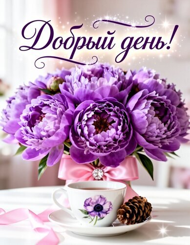 Красивая открытка с пожеланием «Добрый день!» и роскошным букетом пышных фиолетовых пионов. На переднем плане изящная чашка чая с цветочным принтом и сосновая шишка на светлом столе. Нежная и вдохновляющая картинка для отправки друзьям, близким и коллегам в мессенджерах (WhatsApp, Telegram) или социальных сетях. Идеально подходит для создания позитивного настроения и пожелания приятного дня.
