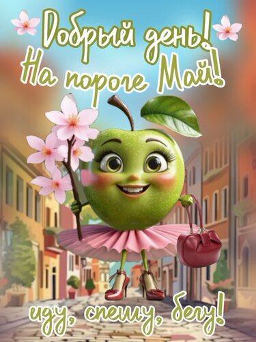 Красочная поздравительная открытка с милым мультяшным персонажем — зеленым яблоком с женскими чертами. Яблоко одето в розовую юбку, на ногах красные туфли на каблуках, в руках — модная сумочка. Персонаж радостно улыбается на фоне уютной городской улицы в весеннем стиле. На картинке крупная надпись на русском языке: "Добрый день! На пороге Май! Иду, спешу, бегу!". Идеально подходит для отправки друзьям и близким в качестве доброго утреннего пожелания или поздравления с наступлением мая.