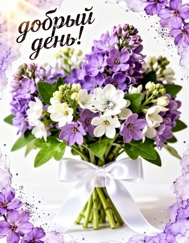 Красивая поздравительная открытка с пышным букетом весенних цветов. В центре композиции — нежные фиолетовые сирени и белоснежные цветы, перевязанные элегантным белым атласным бантом. Изображение украшено декоративной рамкой в виде акварельных фиолетовых пятен и мерцающих блесток. Сверху нанесена стильная надпись на русском языке «Добрый день!», создающая позитивное и теплое настроение. Идеально подходит для отправки в мессенджерах и социальных сетях в качестве доброго утреннего пожелания.