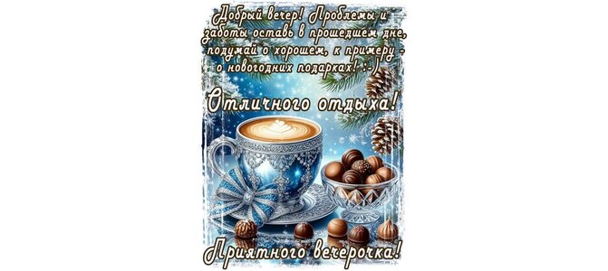 Теги:добрый вечер, вечер, ель, шишки, новый год, новогодние праздники, подарки, пожелания на каждый день, кофе, конфеты, шоколад