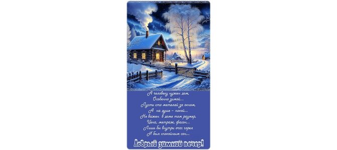 А человеку нужен дом, особенно зимой... Пусть сто метелей за окном, а на душе - покой... Не важен в доме том размер, цена, метраж, фасон... Лишь бы внутри очаг горел и был спокойным сон... Добрый зимний вечер!