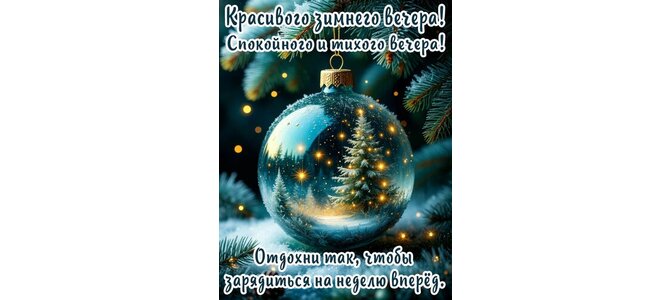 Красивого зимнего вечера! Спокойного и тихого вечера! Отдохни так, чтобы зарядиться на неделю вперёд.