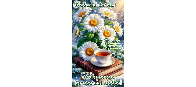 Теги:добрый вечер, вечер, чай, чашка чая, книги, зима, снег, пожелания на каждый деньцветы, ромашки, красивая картинка, добра, тепла, уюта