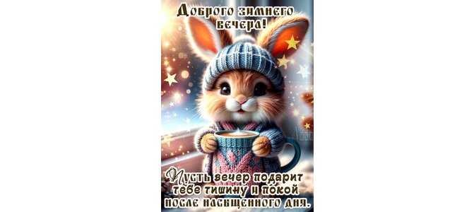 Теги:добрый вечер, вечер, зайка, пушистик, кофе, чашка кофе, покоя, добра, позитива, тишины, зима, снег, пожелания на каждый день