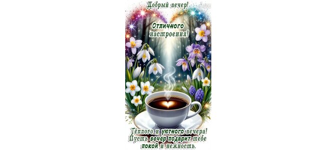 Теги:добрый вечер, вечер, цветы, лес, красивая картинка, пожелания на каждый день, чашка кофе, кофе, сердечко, отличного настроения, покоя и нежности, тепла и уюта