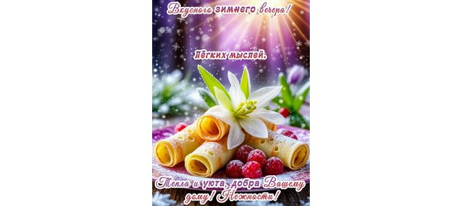 Теги:добрый вечер, вечер, блины, маленица, малина, фрукты, снег, зима, красивая картинка, пожелания на каждый день, тепла и уюта, нежности, легких мыслей