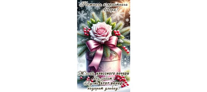 Нежного и приятного вечера! Желаю классного вечера без забот! Пусть этот вечер подарит улыбку!