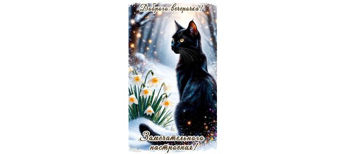 Теги:добрый вечер, вечер, кошка, черная кошка, зима, снег, цветы, пожелания на каждый день, про настроение, красивая картинка
