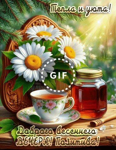 Теги:добрый вечер, вечер, гифка, анимация, цветы, ромашки, чай, варенье, пожелания на каждый день, красивая анимация, позитива, весна, тепла и уюта
