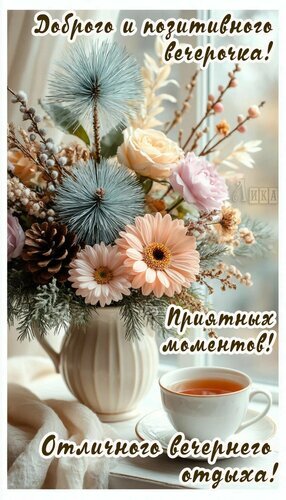 Теги:добрый вечер, вечер, цветы, герберы, розы, ель, чай, красивая картинка, позитива, добра, приятных моментов, пожелания на каждый день, отличного вечернего отдыха