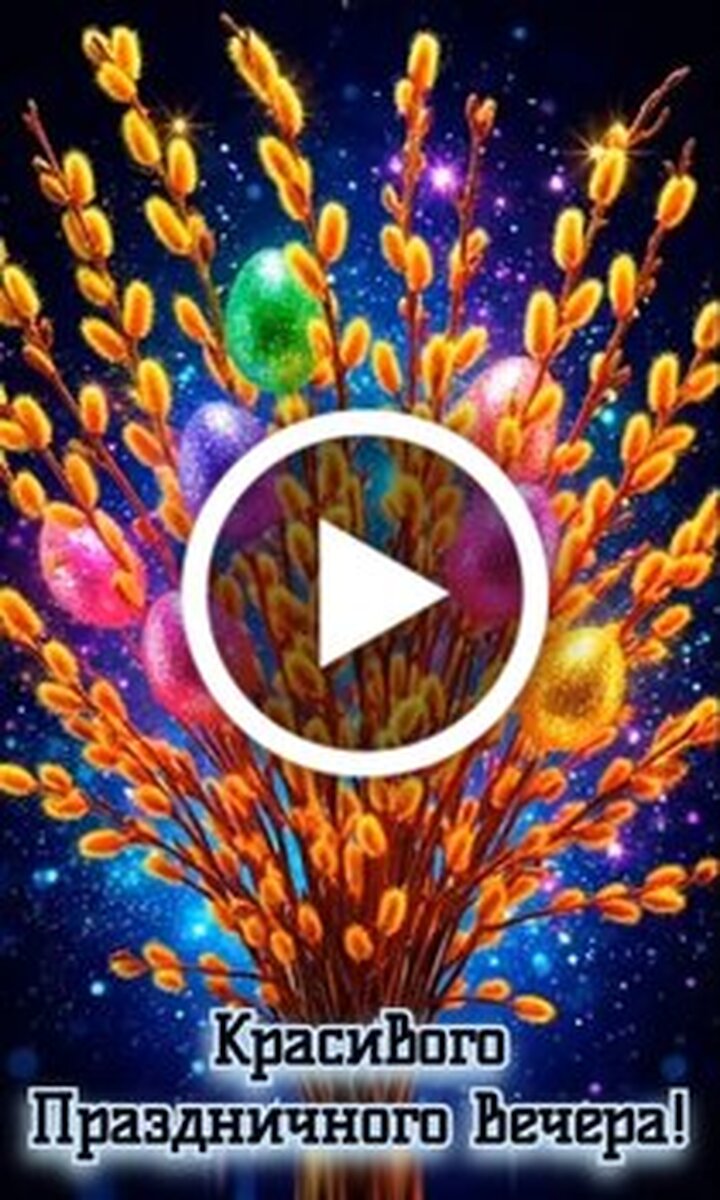 Красивое праздничное видео с поздравительной надписью на фоне яркой пасхальной композиции. На видео изображен пышный букет золотистых верб или веток с пушистыми почками, среди которых расположены разноцветные блестящие пасхальные яйца. Вся композиция наполнена сиянием, искрами и волшебным светом на глубоком темном фоне, что создает атмосферу праздника и тепла. Это идеальное видео для того чтобы пожелать близким и друзьям прекрасного праздничного вечера.