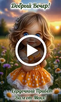 Красивое и доброе видео для пожелания хорошего вечера. На видео запечатлена очаровательная маленькая девочка с большими голубыми глазами и в нарядном оранжевом платье в горошек. Она находится на фоне цветущего луга в лучах закатного солнца. Девочка эмоционально приветствует зрителей, посылает воздушные поцелуи и наполняет пространство вокруг себя летящими белыми сердцами. Это видео наполнено теплом, нежностью и искренним дружеским настроением, идеально подходящее для того, чтобы отправить близким и пожелать им душевного спокойствия и приятного отдыха в конце дня.