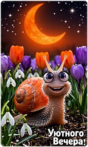 Милая и сказочная иллюстрация с изображением улыбающейся улитки в окружении весенних цветов (тюльпанов и подснежников) под ярким полумесяцем на звездном ночном небе. Картинка выполнена в теплых, уютных тонах и содержит надпись на русском языке «Уютного вечера!». Идеально подходит для использования в качестве поздравительной открытки, пожелания доброго вечера в мессенджерах или публикации в социальных сетях для создания позитивного и спокойного настроения.