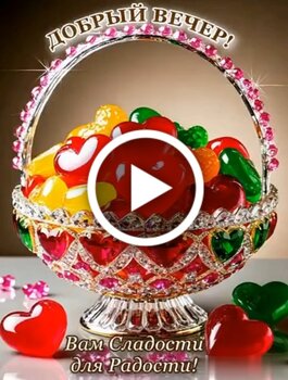Красивое поздравительное видео с пожеланием доброго вечера. В центре композиции находится изысканная декоративная корзина, украшенная сверкающими камнями, которая наполнена яркими желейными конфетами в форме сердец. Разноцветные сладости красного, зеленого и желтого цветов создают праздничное и радостное настроение. На видео наложен текст с теплыми словами: добрый вечер и вам сладости для радости. Это идеальное видео для того чтобы отправить близким, друзьям или любимым в качестве милого визуального приветствия в конце дня.