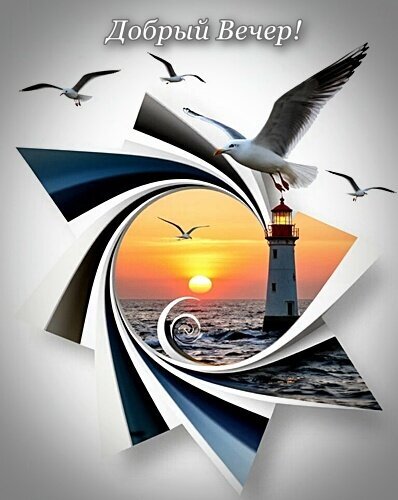 Красивая поздравительная открытка с надписью «Добрый вечер!». Композиция представляет собой стилизованную форму диафрагмы объектива, внутри которой открывается живописный вид на морской закат. В центре кадра — белый маяк на фоне золотистого солнца, опускающегося за горизонт, и спокойные морские волны. По всему небу парят белые чайки, создавая атмосферу умиротворения и свободы. Изображение выполнено в теплых тонах и идеально подходит для отправки близким в качестве вечернего пожелания.