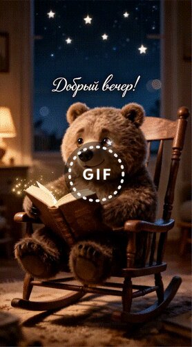 Уютная и теплая поздравительная открытка с милым плюшевым медвежонком, который сидит в деревянном кресле-качалке и читает книгу. Медвежонок выглядит очаровательно и дружелюбно. На заднем плане — спокойное ночное небо со светящимися звездами, видимое через окно, и мягкий свет от лампы, создающий атмосферу домашнего уюта. На изображении присутствует надпись на русском языке: «Добрый вечер!». Картинка идеально подходит для отправки в мессенджерах (WhatsApp, Telegram) или социальных сетях, чтобы пожелать близким спокойного и приятного вечера.