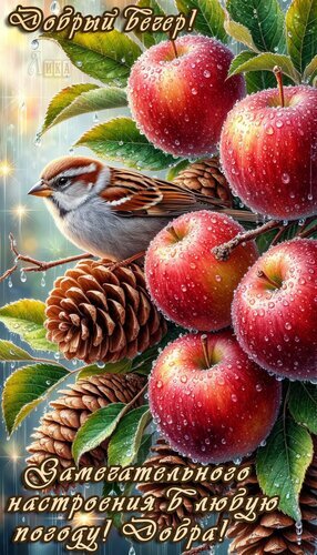 Теги:добрый вечер, вечер, яблоки, воробей, красивая картинка, пожелания на каждый день, добра, замечательного настроения в любую погоду, дождь