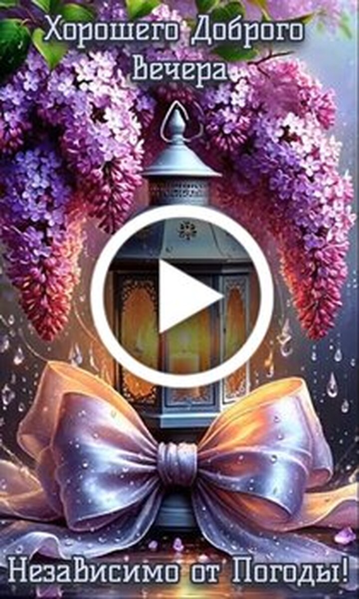 Красивое и атмосферное видео для пожелания доброго вечера. В центре композиции находится изящный декоративный фонарь с теплым мягким светом внутри, украшенный пышным атласным бантом. Фон наполнен нежными цветами сирени, создающими ощущение уюта и спокойствия. На видео нанесен текст пожелания хорошего доброго вечера независимо от погоды. Это идеальный видеоролик для отправки близким, друзьям или коллегам, чтобы поднять настроение и подарить частичку тепла в любое время суток.