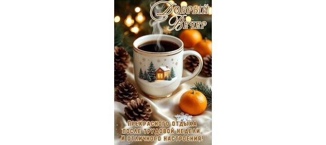 Открытка "ДОБРЫЙ ВЕЧЕР! ПРЕКРАСНОГО ОТДЫХА ПОСЛЕ ТРУДОВОЙ НЕДЕЛИ, И ОТЛИЧНОГО НАСТРОЕНИЯ!"