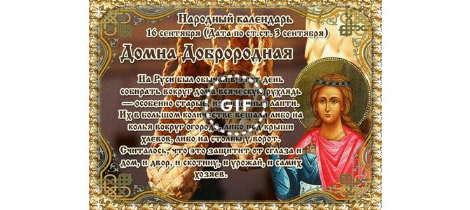 Народный календарь. 16 сентября (Дата по ст. ст. 3 сентября) Домна Доброродная. На Руси был обычай в этот день собирать вокруг дома всякую рухлядь - особенно старые изношенные лапти. Их в большом количестве вешали либо на кольях вокруг огорода, либо под крыши хлебов, либо на столбы у ворот. Считалось, что это защитит от сглаза и дом, и двор, и скотину, и урожай, и самих хозяев.