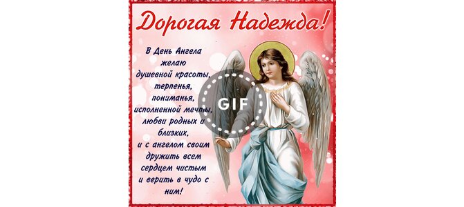 Дорогая Надежда! В День Ангела желаю душевной красоты, терпенья, понимания, исполненной мечты, любви родных и близких, и с ангелом своим дружить всем сердцем чистым и верить в чудо с ним!