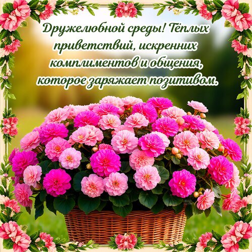 Красочная поздравительная открытка с пышным букетом розовых и ярко-розовых цветов в плетеной корзине. Изображение обрамлено нежной цветочной рамкой. На картинке наложен вдохновляющий текст на русском языке: «Дружелюбной среды! Тёплых приветствий, искренних комплиментов и общения, которое заряжает позитивом». Идеально подходит для отправки в мессенджерах и социальных сетях для пожелания хорошего настроения в среду.