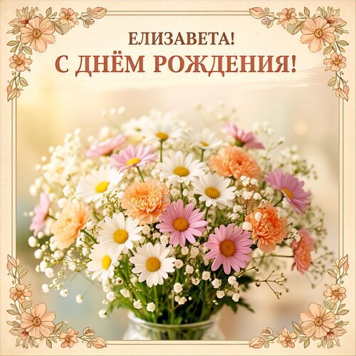 Красивая поздравительная открытка с надписью «Елизавета! С днём рождения!». На изображении представлен пышный и нежный букет из разноцветных ромашек, хризантем и гипсофилы в стеклянной вазе. Композиция дополнена изящной цветочной рамкой в пастельных тонах. Идеально подходит для отправки в качестве электронного поздравления женщине, подруге или коллеге по имени Елизавета. Теплая, светлая и праздничная атмосфера картинки вызывает положительные эмоции.