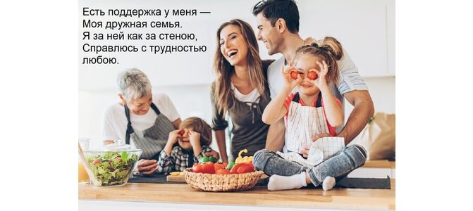 Есть поддержка у меня — моя дружная семья. Я за ней как за стеною, справлюсь с трудностью любою.