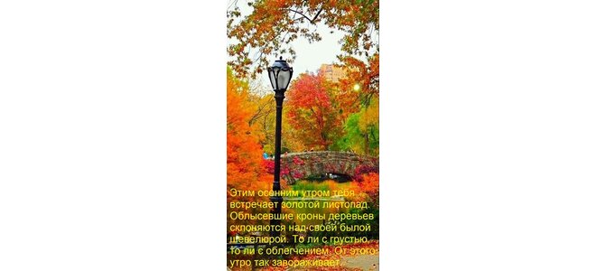 Открытка "Этим осенним утром тебя встречает золотой листопад. Облысевшие кроны деревьев склоняются над своей б"